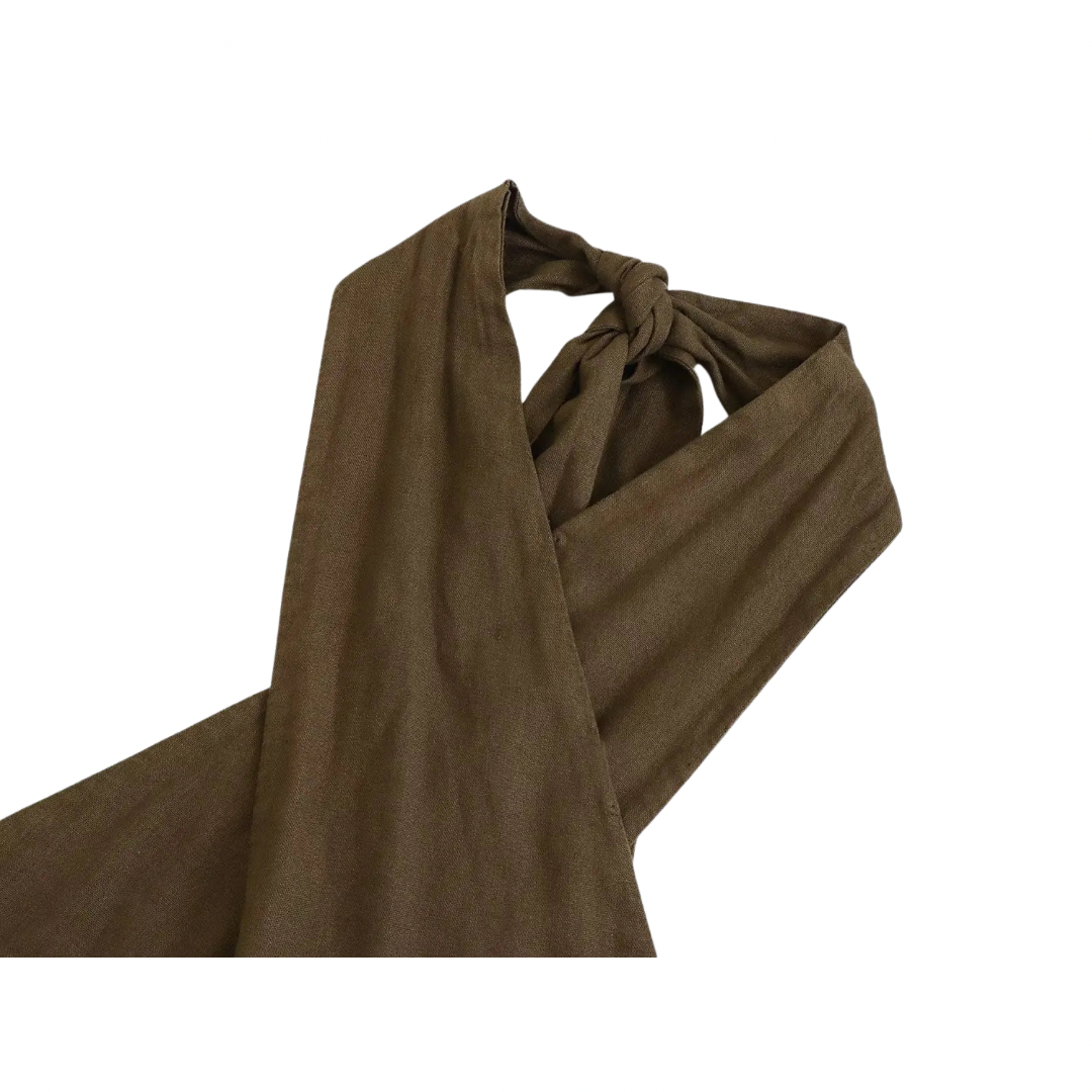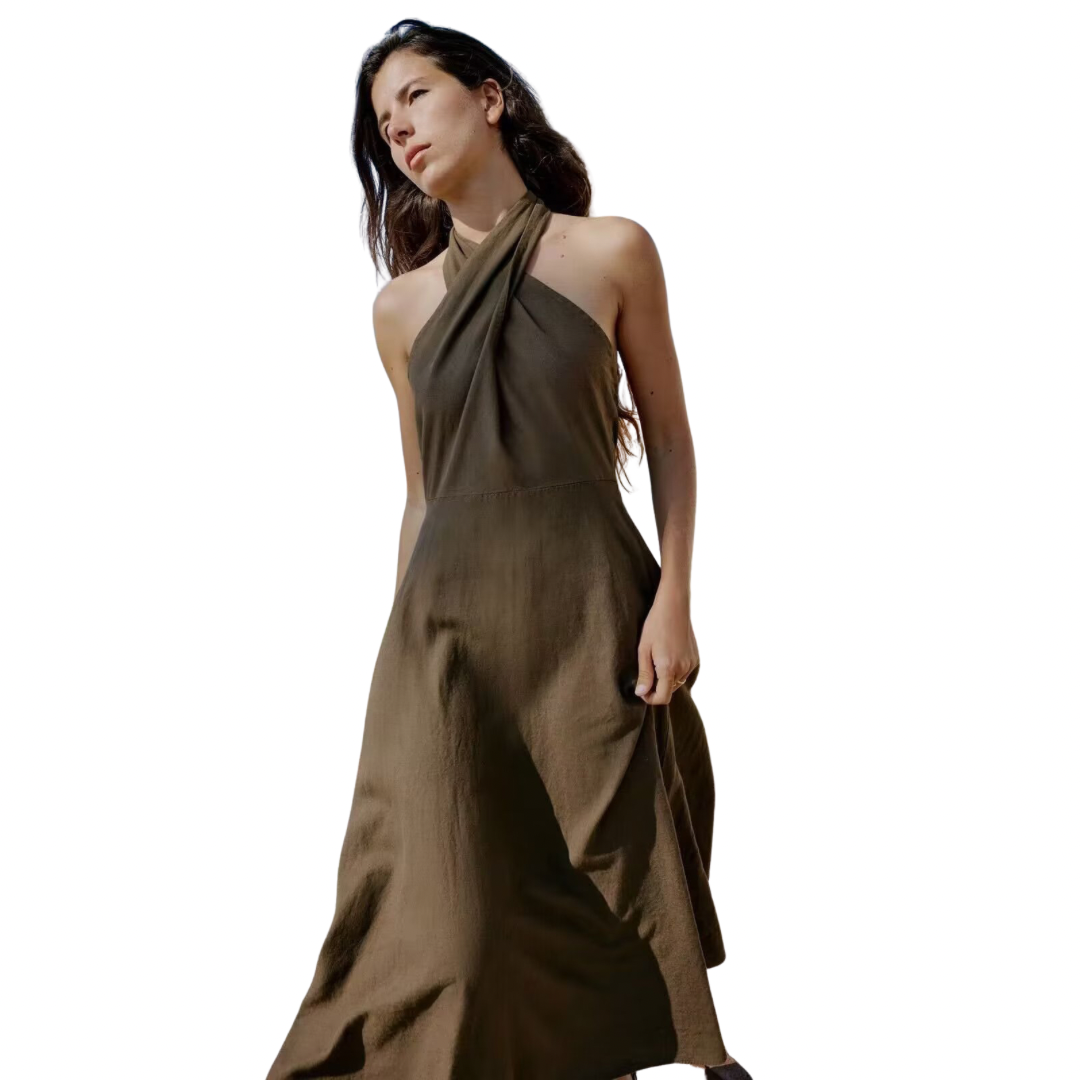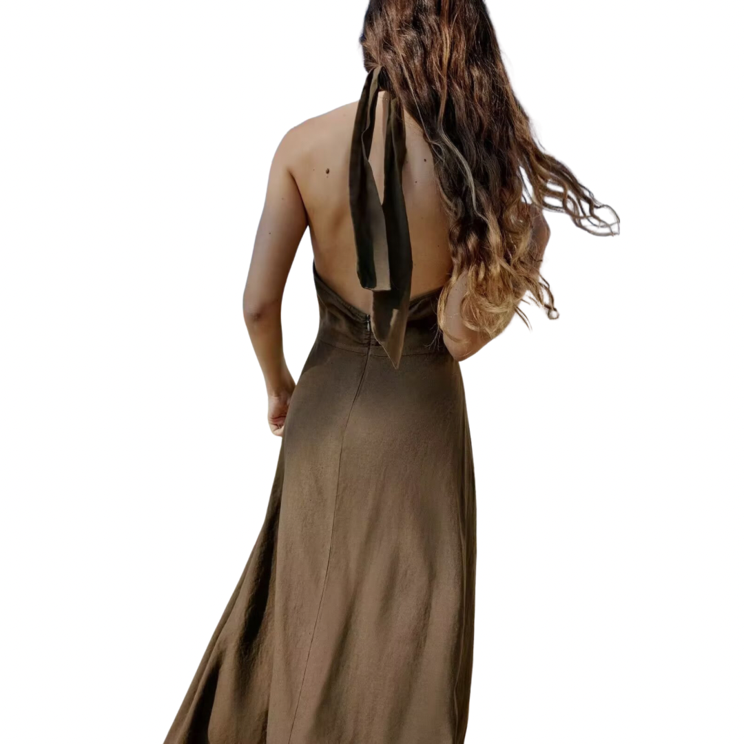 A study in warm-weather elegance. This cotton-linen blend midi dress features a halter neckline and a softly spliced skirt—designed to move with grace and frame the silhouette with ease. Perfect from sunlit gatherings to summer evenings.