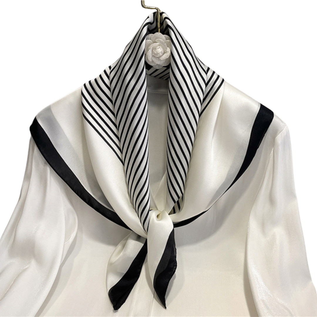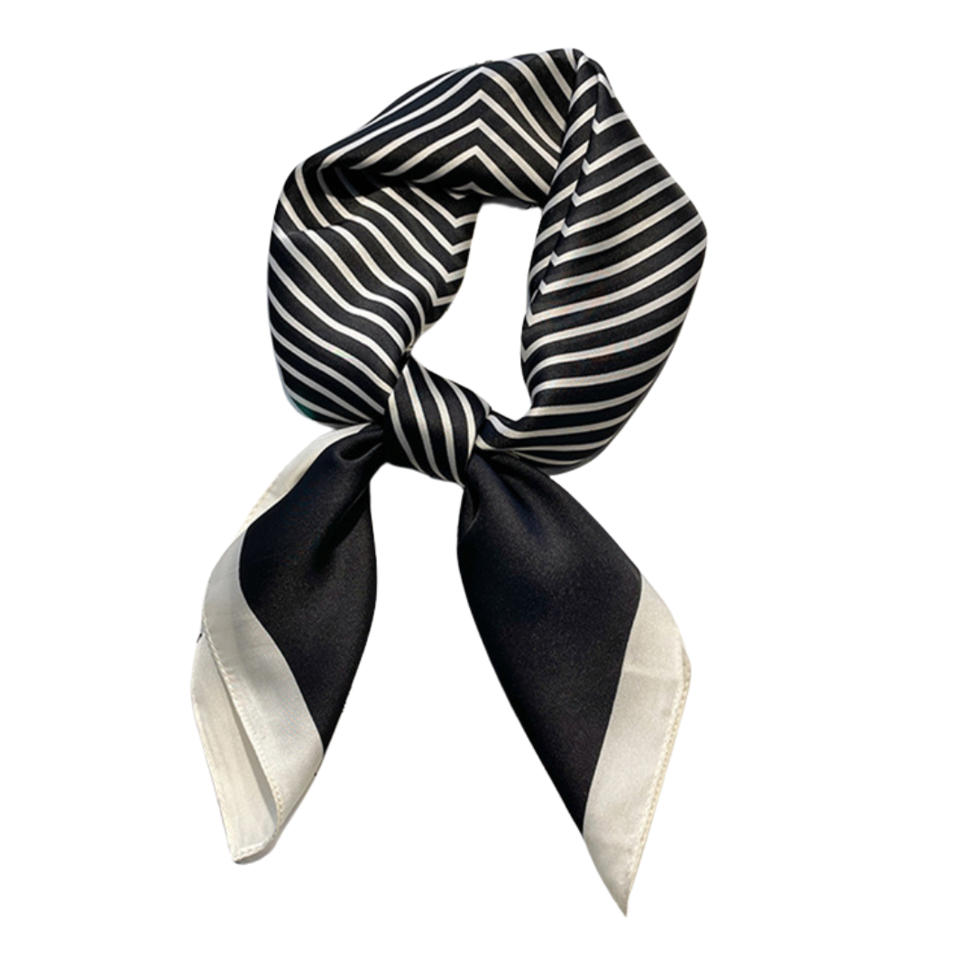 Available in classic black and timeless white, this scarf effortlessly complements any outfit, adding a touch of elegance and refinement. Its compact size of 20x20 cm makes it easy to style in various ways—wrap it around your neck, tie it in your hair, or adorn your handbag for a fashionable flair.