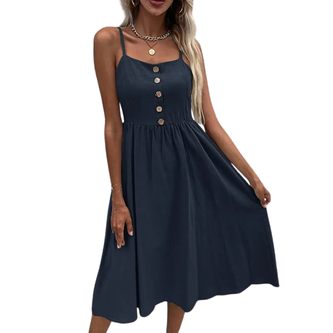 Refined ease with a feminine edge. This sleeveless midi dress features a buttoned front, sling straps, and a flowing A-line silhouette—crafted for comfort, designed to flatter.