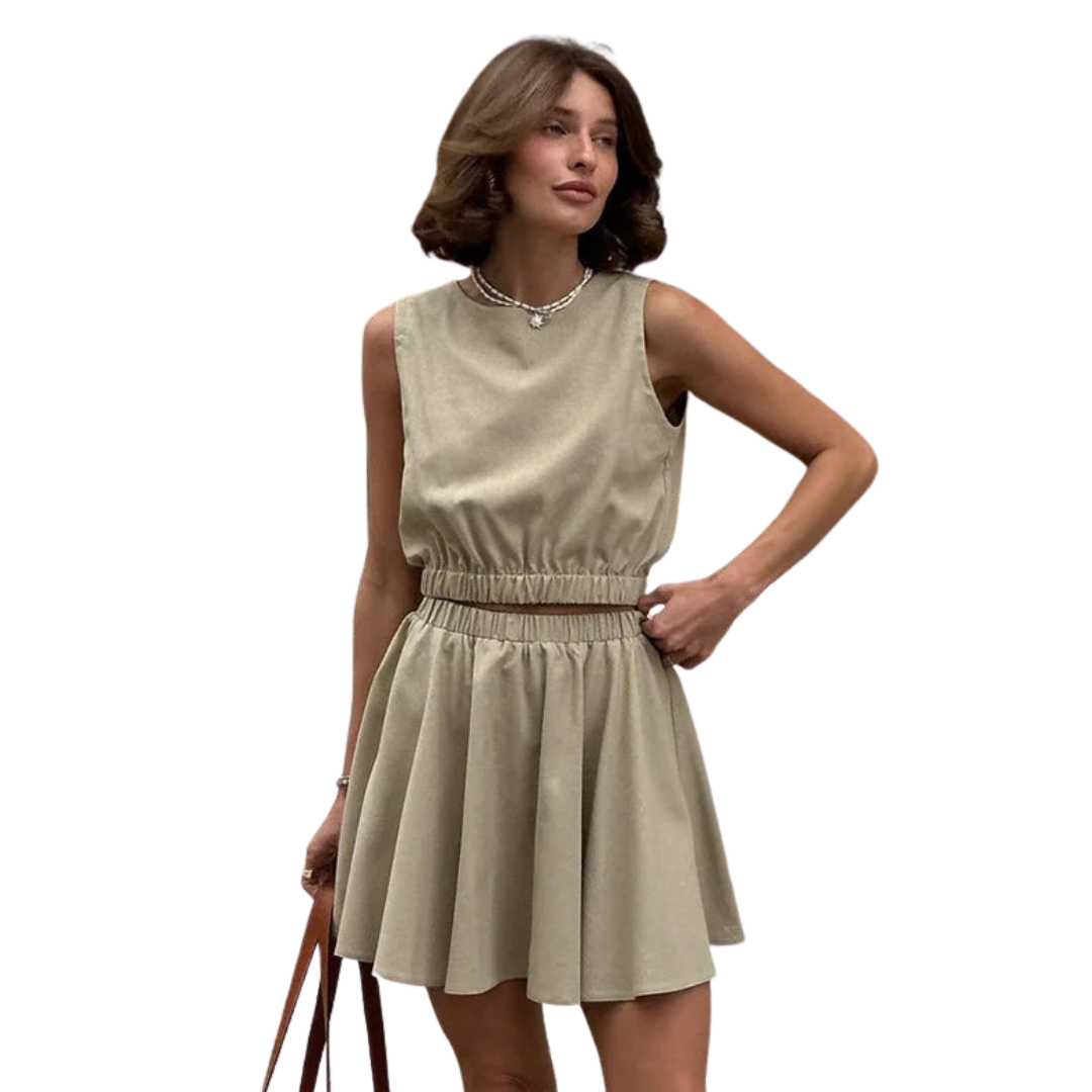 Light, playful, and polished. This warm-weather set pairs a sleeveless round-neck top with a pleated mini skirt—crafted for carefree days and understated elegance.