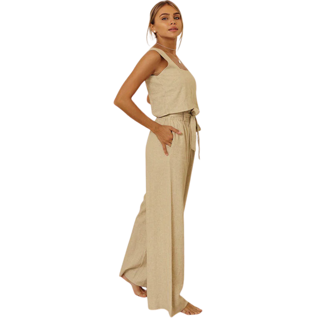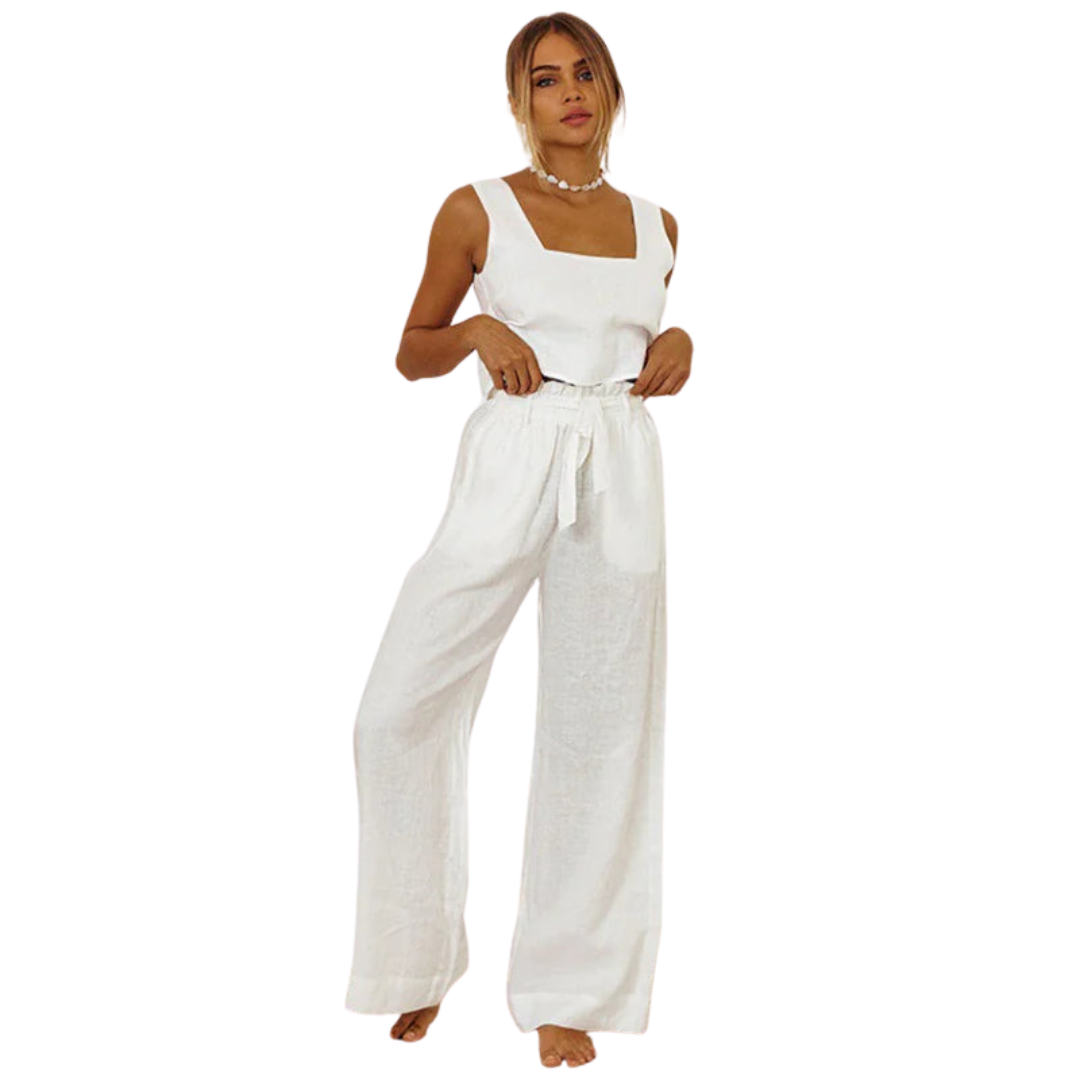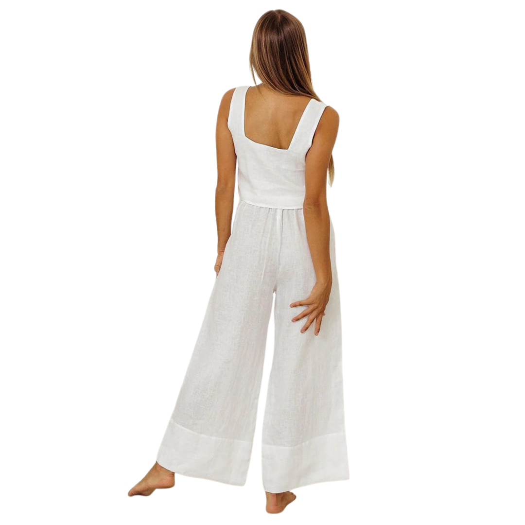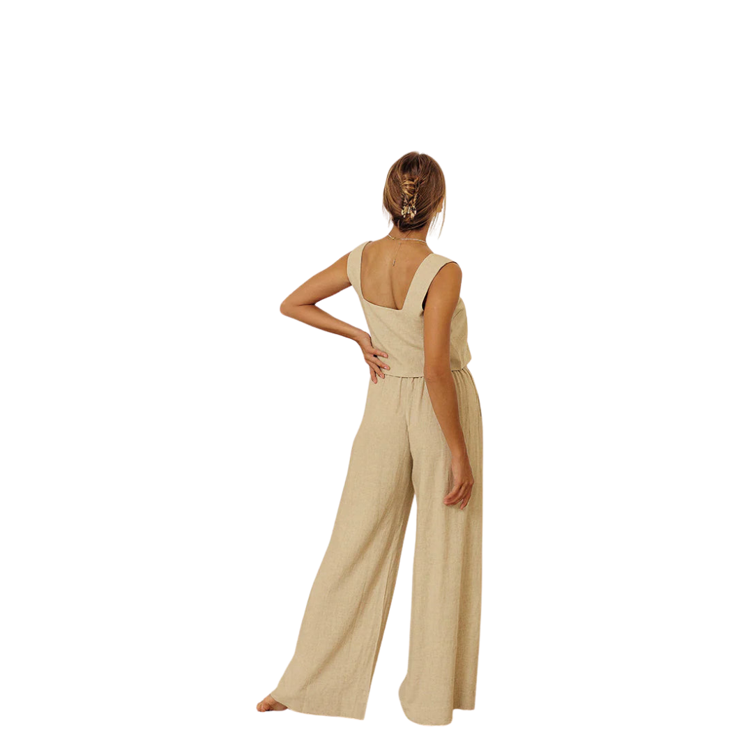 An ode to summer refinement. This two-piece ensemble, crafted from a breathable cotton-linen blend, combines relaxed tailoring with understated elegance. The sleeveless vest and wide-leg trousers move with ease—designed for warm days and unhurried moments.