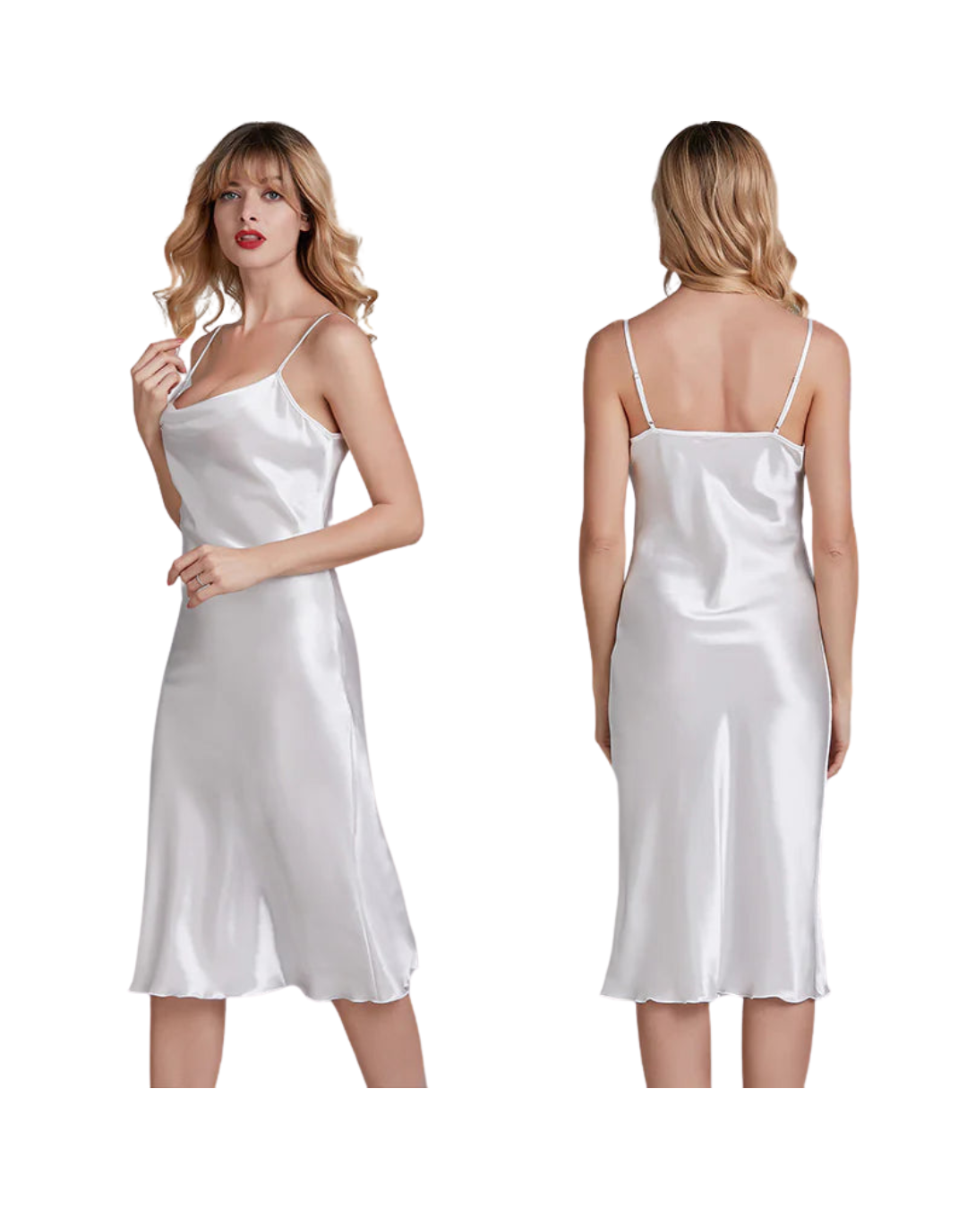 This 100% silk dress exudes elegance and luxury. Featuring a sleeveless design and a sophisticated cowl neck, this midi satin dress is perfect for women seeking timeless style.
