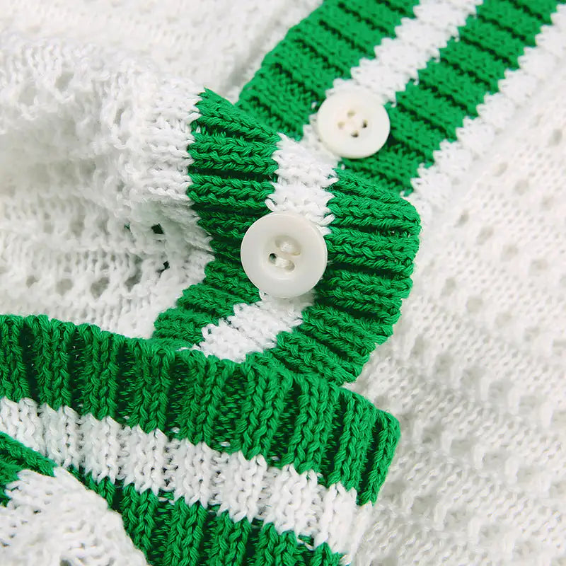 Design: Crochet knit; mini length; front button closure; short sleeves; contrast green collar and trims