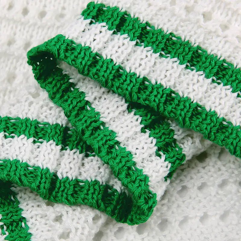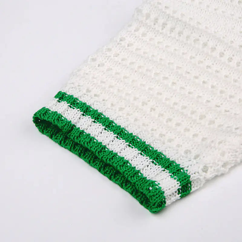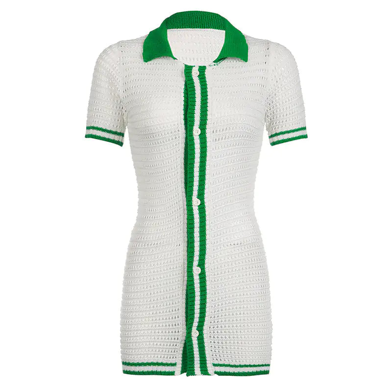 A playful nod to vintage sportswear, this crochet knit dress blends texture and structure in a flattering mini silhouette. With its polo collar and contrast trim, it’s a chic choice for warm days, whether you're brunching or browsing the farmer’s market.