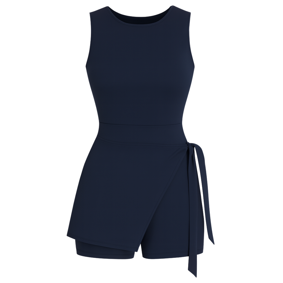 Sleek, supportive, and designed to move with you. This faux two-piece athletic one-piece features a built-in wrap-tie skirt detail and compression fabric that smooths and supports. Crafted from breathable, moisture-wicking material, it offers both comfort and confidence—perfect for training, stretching, or stepping out in style.