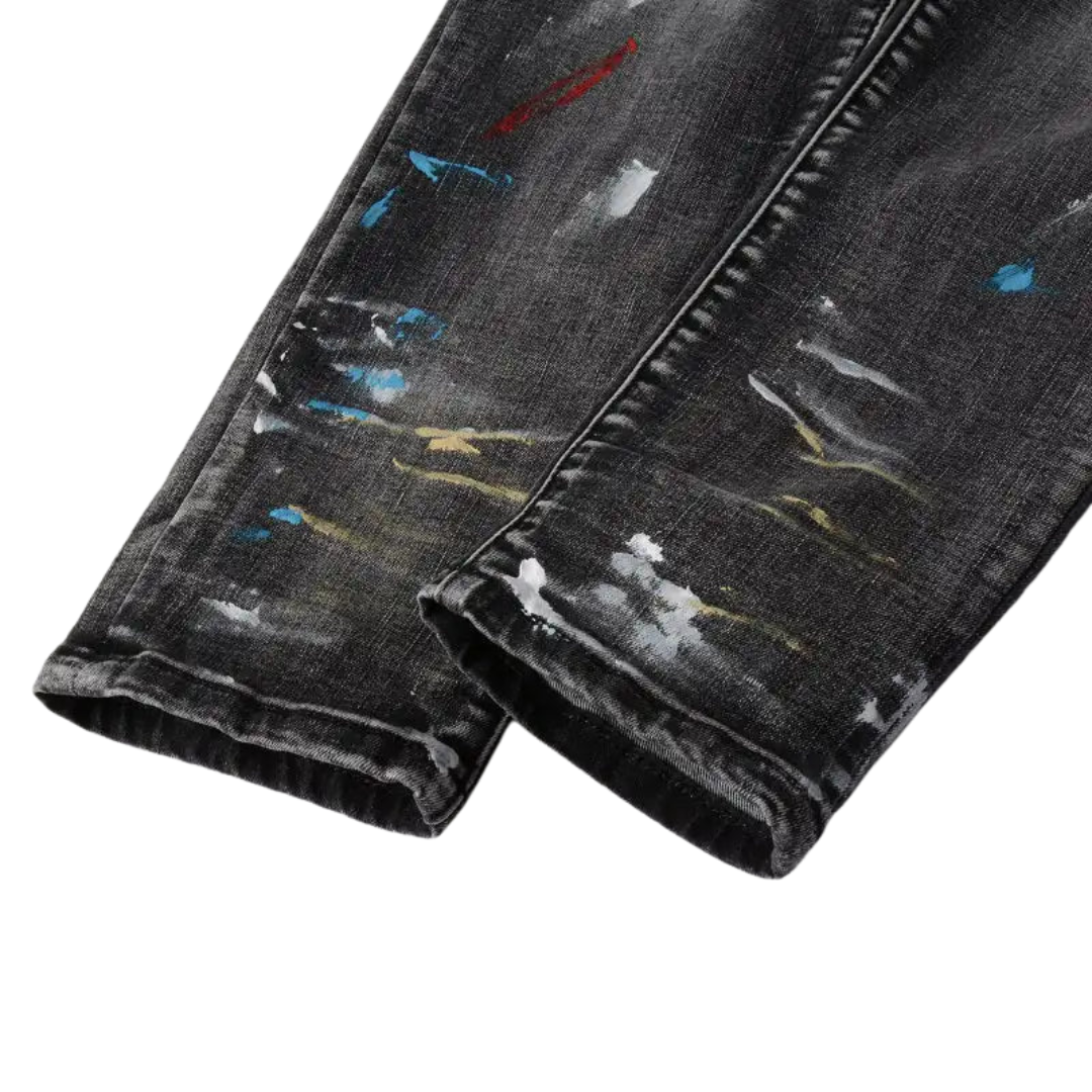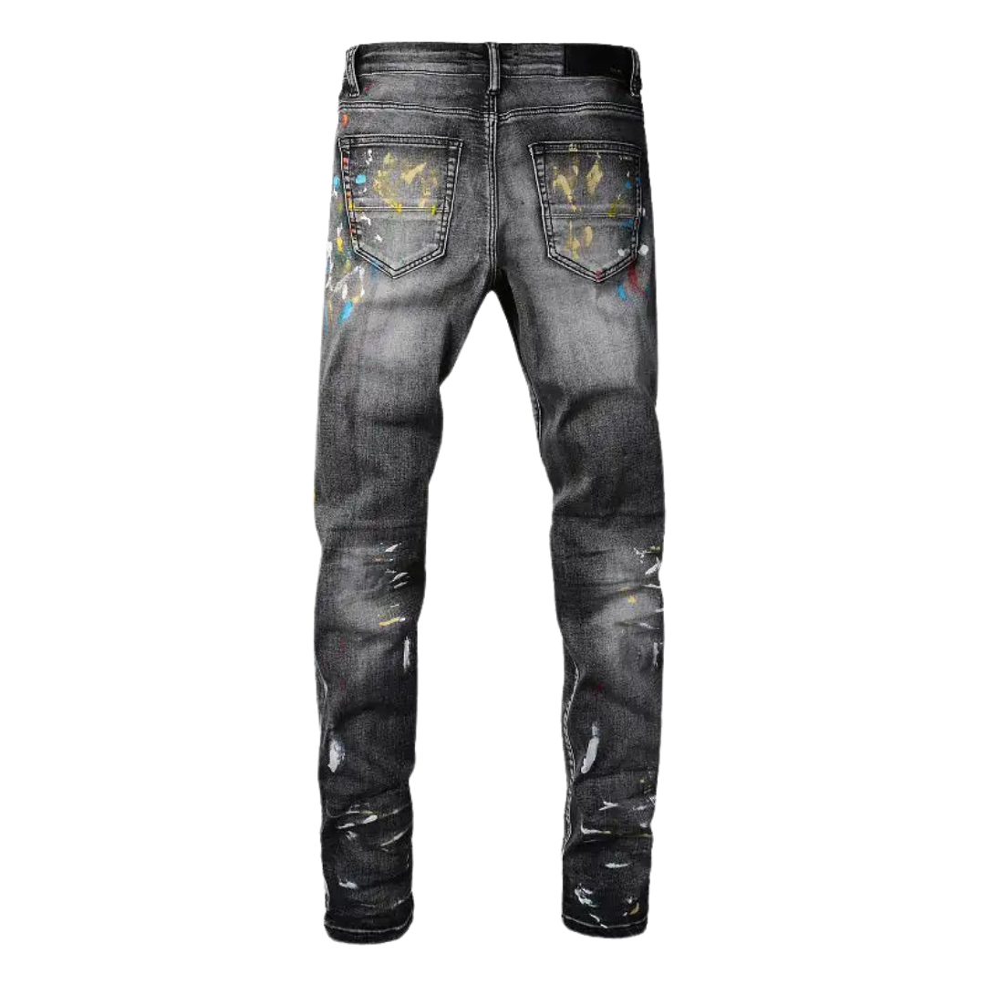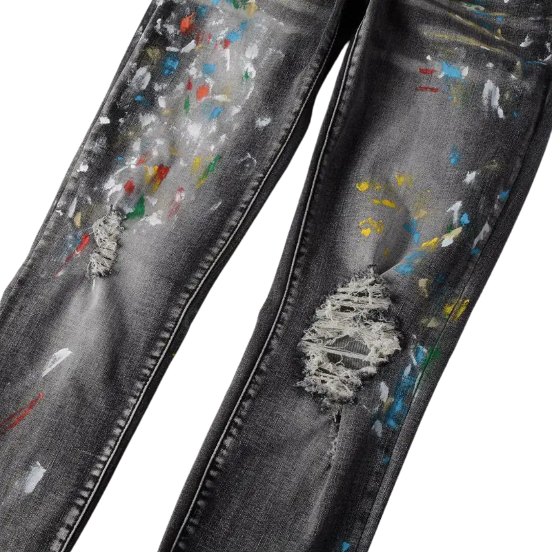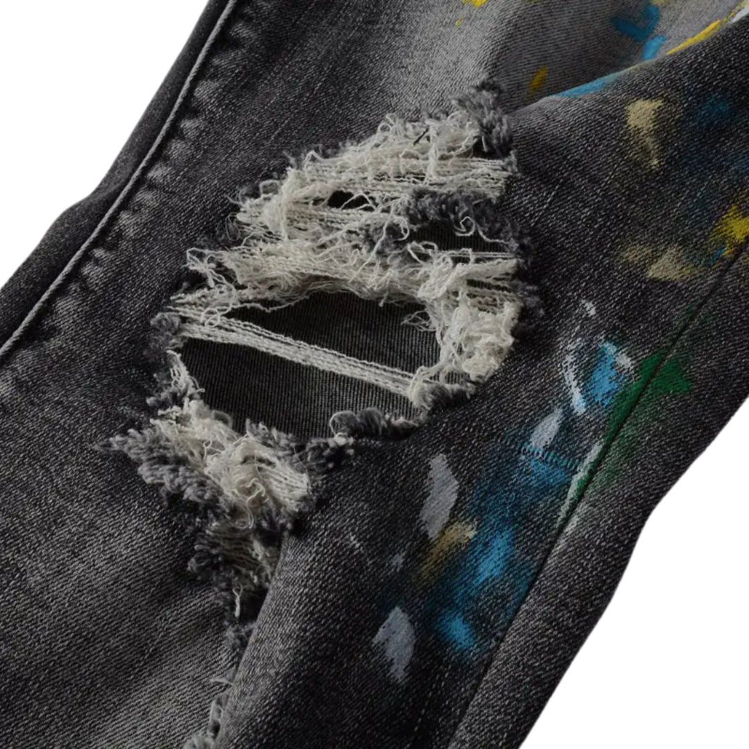 Speckle Ink Printed Vintage Pleated Ripped Jeans
