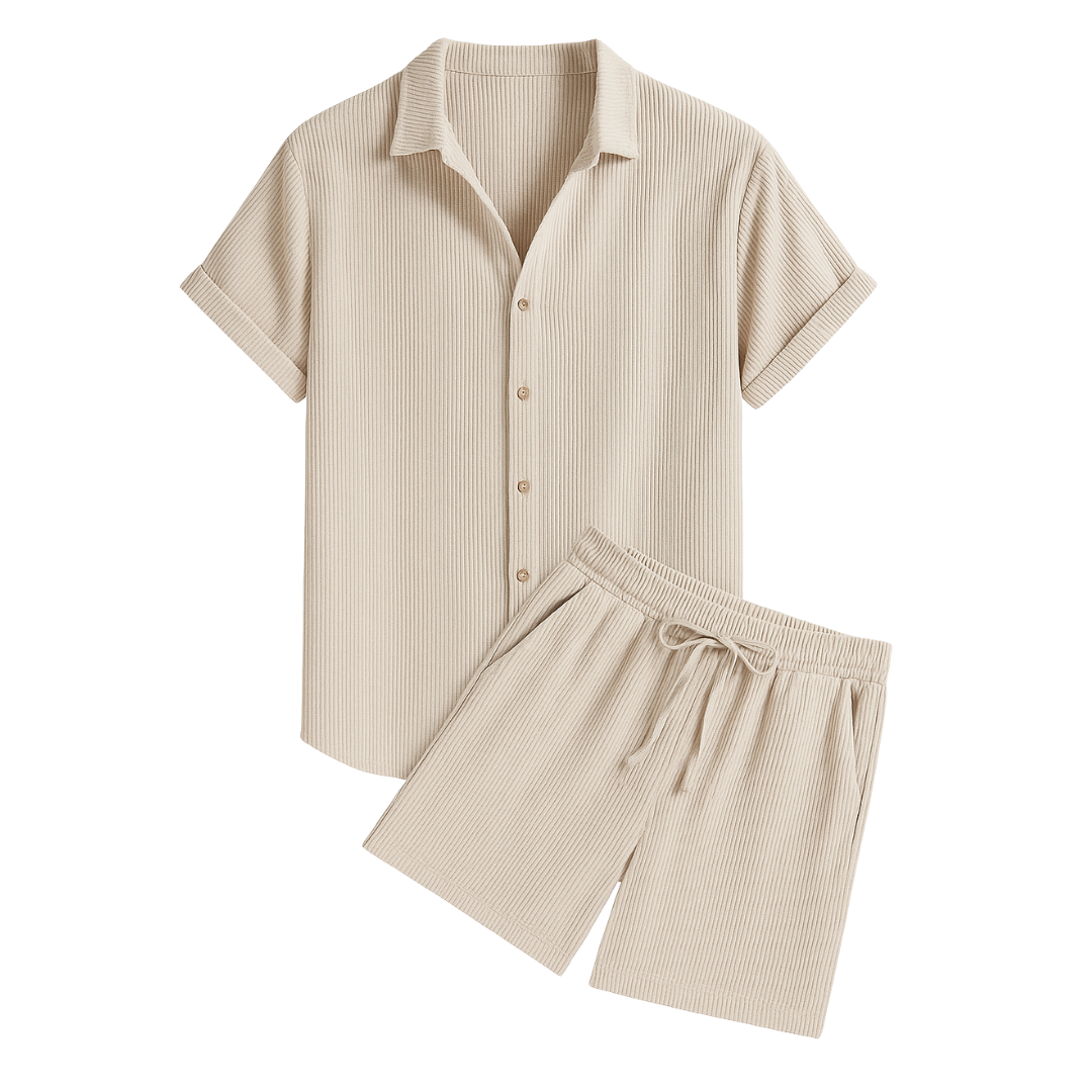 Polished yet relaxed, this two-piece set pairs a clean-cut polo shirt with tailored shorts—designed for effortless summer styling. The classic collar and button-front elevate the top, while the relaxed-fit shorts offer all-day comfort with a structured finish. Crafted from lightweight ribbed fabric, it adds subtle texture while remaining breathable and refined.