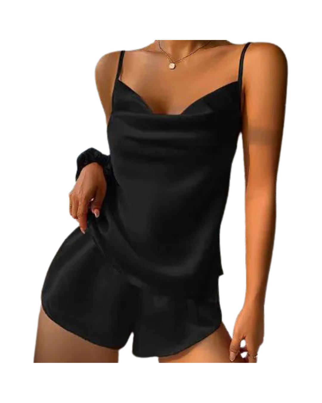 A two-piece satin set designed for comfort and ease. The top features slim straps and a soft neckline, paired with matching relaxed-fit shorts. Ideal for warm nights, self-care evenings, or lounging at home.