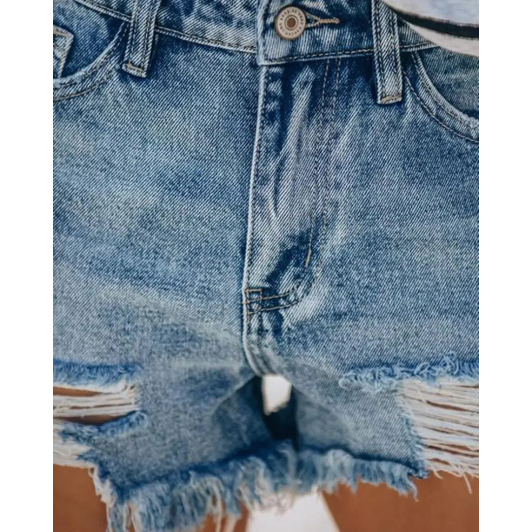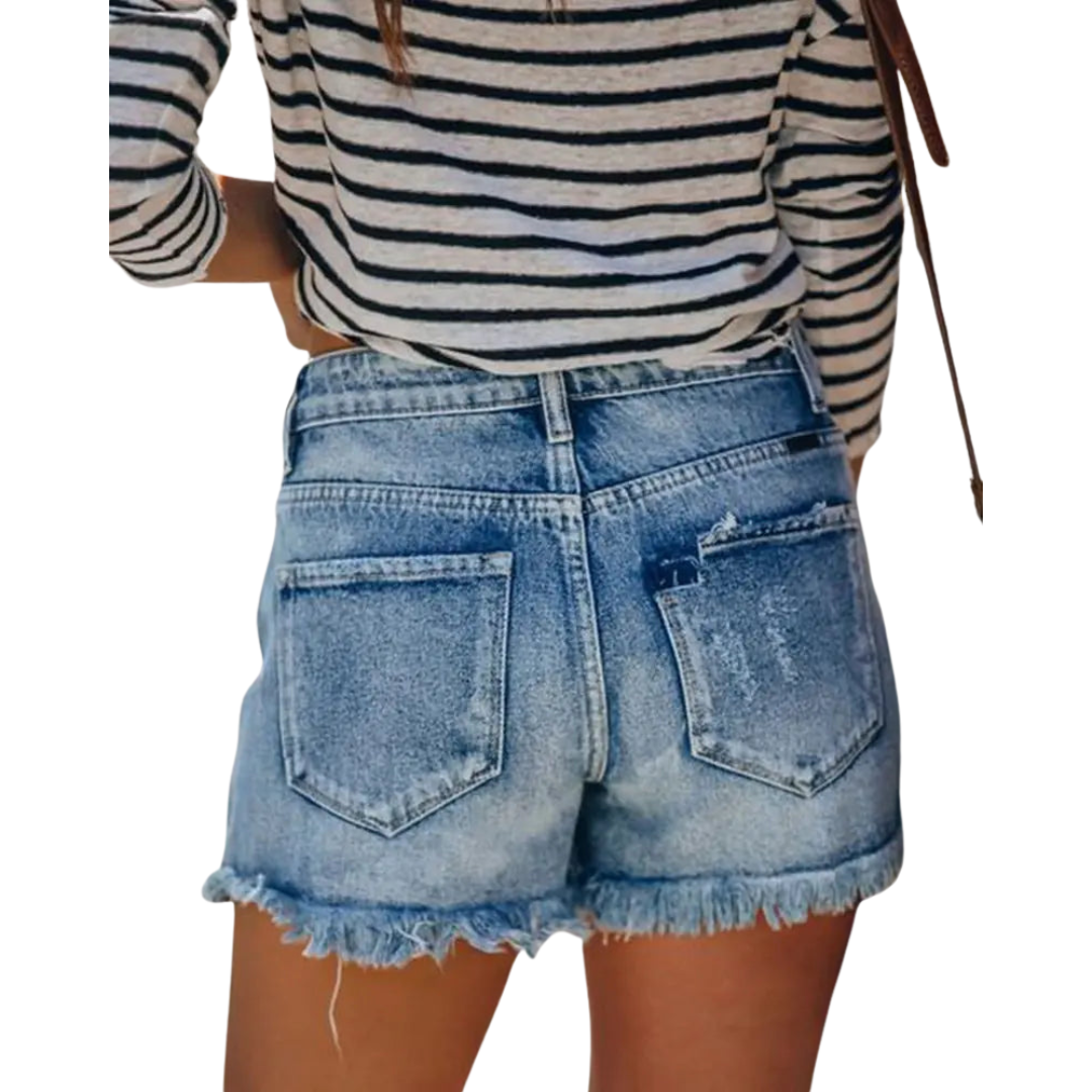 A warm-weather staple reimagined with edge. These high-waisted denim shorts feature distressed detailing and raw hems for a lived-in feel that’s effortlessly cool.